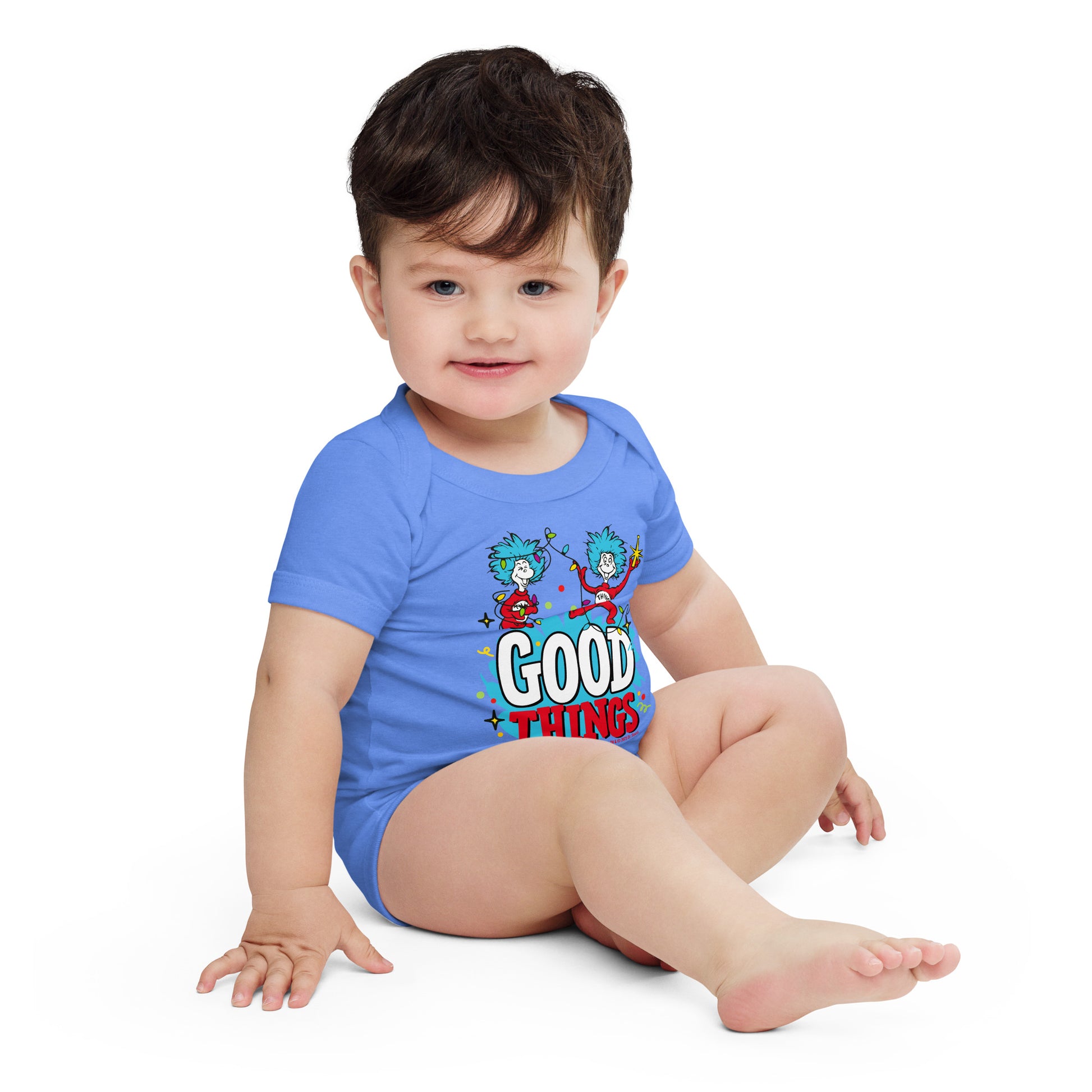 Celebrate the season with a touch of Seussian cheer! This Dr. Seuss Holiday Good Things Baby Bodysuit features the lovable Thing 1 and Thing 2 dressed for the holidays, bringing smiles and festive fun to your little one’s wardrobe.